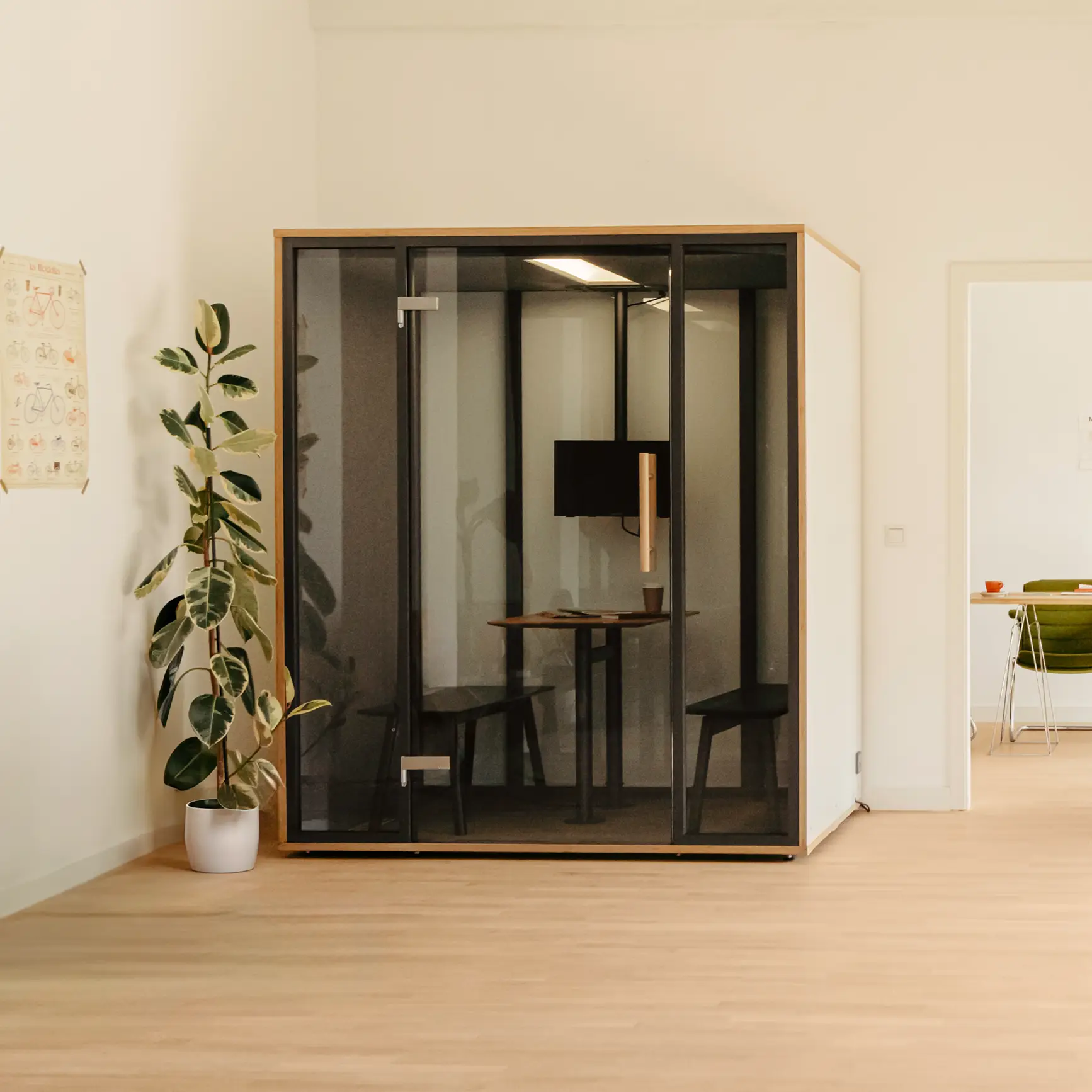 Einige Telefonboxen werden vom Hersteller bereits zusammengebaut geliefert. Was nach weniger Aufwand klingt, erfordert allerdings gute Planung: Bei dieser Art der Lieferung musst Du sicherstellen, dass Dein Bürogebäude über einen Lastenaufzug verfügt oder auf einem anderen Weg wie geplant in die Büroräume geliefert werden kann. Telefonboxen für eine Person können in vielen Fällen selbst aufgebaut werden. Der Selbstaufbau dauert durchschnittlich etwa eine Stunde, spart Dir aber bares Geld. Bei Meetingboxen ist die Montage durch Spezialist*innen jedoch immer notwendig.